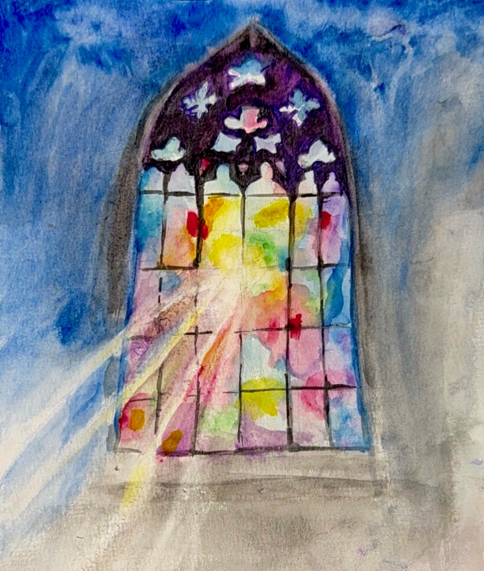 The sun comes out from behind the clouds. I first notice a small crack of light in the upper corner of the stained glass, and I nearly gasp with joy.